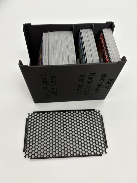 Pojemnik na karty mieści wszystkie karty z gry podstawowej i wyżej wymienionych dodatków w koszulkach premium.