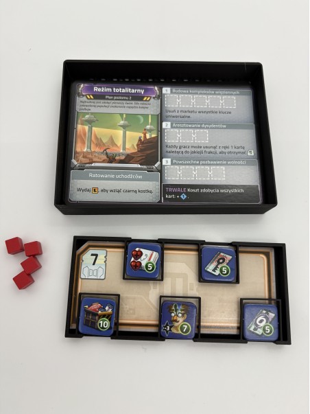 Kafel sklepu posiada pojemnik z ramką, który trzyma żetony zarówno w pudełku jak i w trakcie gry. Wystarczy wyłożyć go na stół i gotowe!