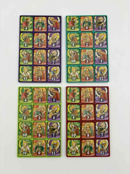 Dedykowane planszetki na apostołów w kolorach graczy.